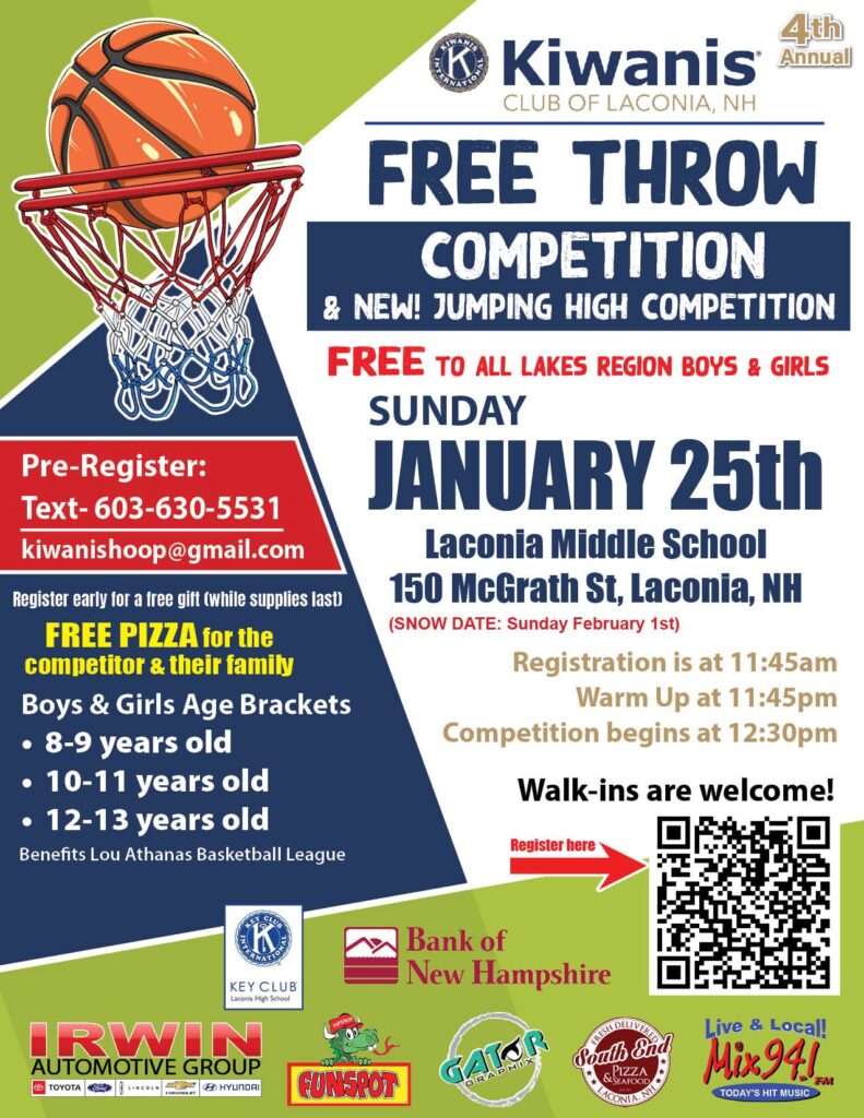 Boys and girls from across the Lakes Region are invited to participate and showcase their basketball skills in a fun, friendly, and supportive environment at our fourth annual Free Throw Competition! The Laconia Middle School Gym will be jumping on January 25th as we add a vertical leap competition this year as well! It’s free to enter, and the competitions are open to all Lakes Region boys & girls from ages 8 through 13.